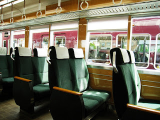| 這是去程尚未換嵐電的京福電車內裝,綠色系座椅,車廂不多 |