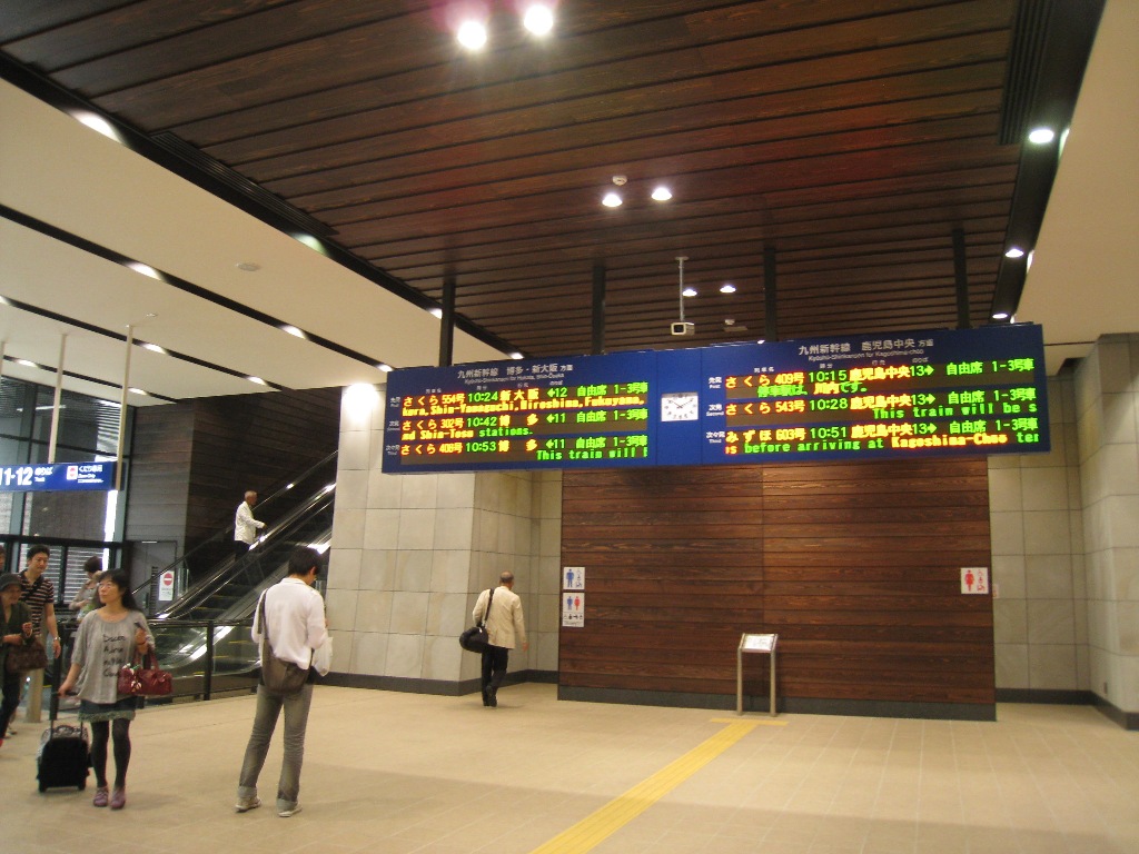 於一整天都在坐車,沒有跑太多實際行程,這樣的成本有點昂貴,最後決定放棄阿蘇,其中最重要的因素是昨天回程已搭乘過同〈九州横断〉車型之列車,雖然無法一覽傳聞中熊本到阿蘇間的美麗風景,就等下次有機會再來"橫斷"吧!一早盤算行程,決定更改熊本一日遊後,吃完早餐先到車站換票再回飯店整理儀容,以為可以悠閒一點,結果,太過悠閒差點又趕不上火車!眼見只剩兩分鐘才踏進車站,和前兩日不一樣,怎都找不到月台,問了站務人員,才知搭到熊本的路線是新幹線,非JR地方列車,必須要走到更裡面搭乘扶梯才會看到月台。頓時慌了手腳,一路狂奔,上車後不到三十秒就開車,也太過驚險,心臟都快停止。會這麼趕只因一早已換過票,不好意思因延遲而再次換票。老實人我擔心站務人員給台灣人貼標籤啦!告誡自己下次千萬別再悠閒過頭,免得樂極生悲~去程搭乘新開通不久的九州新幹線〈つばめ号〉,由新大阪出發至鹿兒島 |